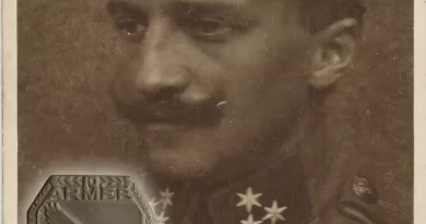 Sajnos itt nem látszik a jelvény teljes alakja, csak a fele. A fotón a Magyar királyi 1. Honvéd Huszárezred jelvényét viseli a hadnagy úr. A felvétel a Nagy Háborút követően készülhetett, bár a kardbojton még a IV.Károly császár és király monogramja (nagy K) betű kivehető, viszont a csákórózsája a tiszti csákón már trikoloros nemzeti színű nem a fent említett K-s. Új típusú a zubbony gallér rangjelzése is. Kitüntetésekkel szépen dekorált (6 db ferdén rögzített szalagsávja van).