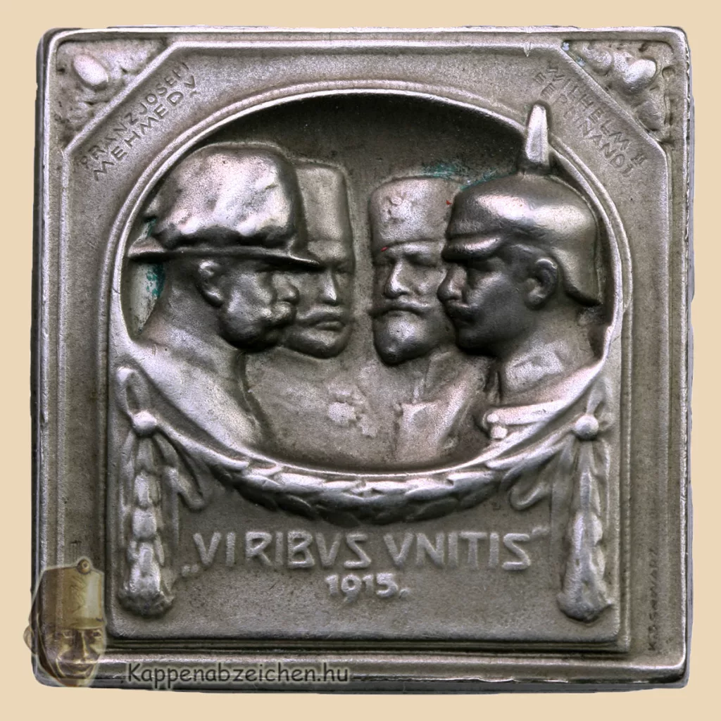A propaganda jelvények többsége a négy szövetséges ország nemzeti színeit kombinálta. Sokszor a négy ország katonáit mutatták be, de ebben a vonatkozásban főként a Monarchia és Németország katonái szerepeltek együtt. Néhány esetben az uralkodók közös portréképeit látjuk a jelvényeken. Ezek közül a legismertebb, leggyakoribb a négy császár mellképével díszített jelvény. Erről képes levelező lap is készült, amit itt mutattam be. Most egy viselési fotót láthatunk.