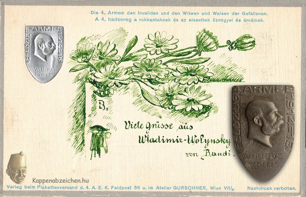 A jelvényt alapesetben 1914-15 évszámokkal készítették, ez a leggyakoribb. De egy évvel később még 1914-16-os évszámmal is gyártottak belőle, ez már ritkább. Ebbe a bejegyzésbe ezt a változatot töltöttem fel. A jelvény képével dombornyomott levelező lap is készült. Az itt látható példányt egy ráérő katona szép tavaszi csokorral is dekorálta.