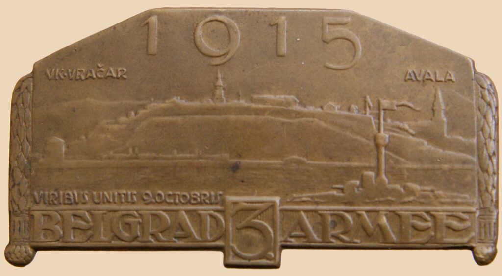 A város a Monarchia határán feküdt, a Száva folyó túloldalán a Magyar Királysághoz tartozó város Zimony áll. Ezért a nagy Háborúban a szerbekkel kialakult konfliktus során a Monarchia első támadó műveletei Belgrádot érték. Ez a tény is indokolta, hogy a város ostromában részt vevő csapatok részére a város látképével díszített jelvény készült, amit ebben a bejegyzésben mutatok be. A központi szereplő a belgrádi erődöt támadó egyik dunai monitor. A háttérben az erőd mögött a város látképén két objektumnak a neve is szerepel.
