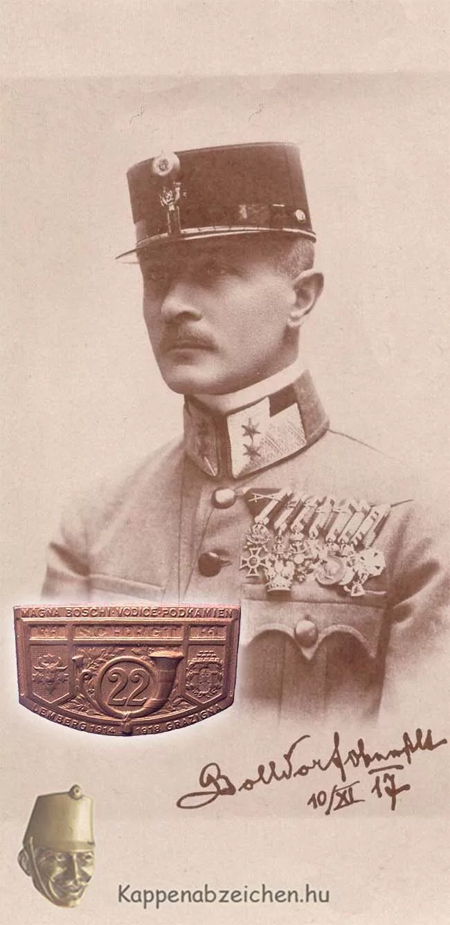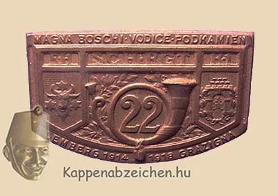 A 22-es Landwehr ezred bukovinai volt, Csernovitzban volt a parancsnoksága békeidőben. A bejegyzésben látható fotó azért érdekes, mert az ezredparancsnok csákóján a 22-es számú kis kürt jelvény látható. Vagyis, ezeket a jelvényeket nem csak a tábori vadászok, de a Landwehr ezredek katonái is viselték. A bejegyzéshez a 22-esek lemezjelvényét mellékelem, amelyen a csatahelyek felsorolásában szerepel a Grazigna név is.