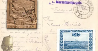 The battlefields cited on the Kappenabzeichen of the 7th Mountain Artillery Regiment all recall the mountain terrains of the Great War, from Albania to Italy. The badge was made by the Arkansas company. It is interesting that two versions are known. One of them is the badge addressed to the 7th Mountain Artillery Regiment shown in the opening picture. At the same time, there was also an unnumbered version, which I inserted into the body of the text. Here, the space for numbering was left empty: everyone could engrave the number of their own unit if they wanted. The postcard shows the numbered copy. It comes from the collection of my friend Gábor Csiszér. It is interesting that it does not record the names of the battlefields, but depicts a mountain cannon with its operators. So it is not exactly like the badge.