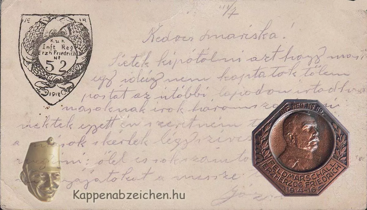 In several posts I have referred to badges as “non-existent”. These are the rarest pieces that I have not or hardly ever encountered yet. The protagonist of this post is a badge that does not really exist, a badge design presumably. Obviously, we are not talking about the very common badge, the one depicting the regimental owner Archduke Friedrich, but the depiction seen on the postcard.