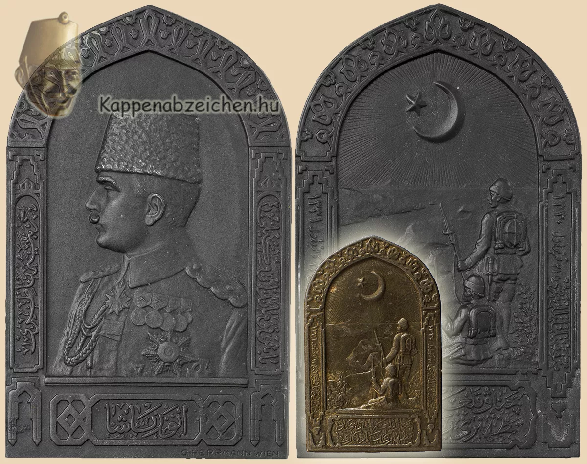 A plakett másik oldalán Enver pasa szép portréja látható. Egyetlen más korabeli plaketten vagy jelvényen sem látható ehhez hasonlóan kidolgozott ábrázolása. Érdekes módon viszont a többi Herrmann plakettről sem vett át portrékat a művész plakettjeiről a jelvény-gyártó Winter és Adler cég. Pedig olyan ismert, sok jelvényen szereplő személyiség, mint Boroevic Szvetozár szintén megtalálható az egyik plaketten. Így aztán Enver pasa portréja sem került rá nagyobb darabszámban gyártott sapkajelvényre. Egyetlen kivételről tudok, 1. Ferdinánd bolgár cár portréja is egy Herrmann plakettről származik (itt).