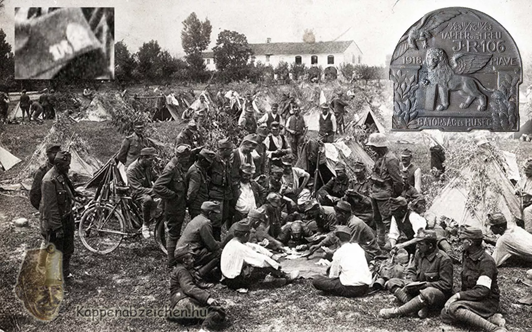 Most ismét előkerült, mert a Fortepan kincsesládájában rábukkantam egy rendkívül jó fényképre, amin ketten is viselik a jelvényt. Tábori jelenet, nagy kártyacsata van megörökítve, amelyet tucatnyi kibic szemlél. 1918 nyarán vagy kora ősszel készülhetett, hiszen a jelvény egyértelműen utal a kudarcba fulladt nyári Piave offenzívára. Ebben az ezred derekasan helytállt, sikerült átkelnie a Piave folyón, de az offenzíva lefújása miatt vissza kellett térniük a kiinduló állásokba. A kép érdekessége még, hogy a jelvény mellett az egyik sapkán az ezredszám is látható.