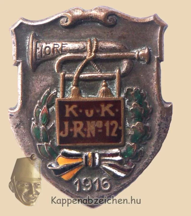 A középen álló tiszt sapkáján egy kis háromszög alakú jelvény a magasabb egység, a 33. hadosztály jelvénye. Ezen a szám nem látható ugyan, de a 12-esek volt parancsnoka Magerl-Kouffheim ezredes sapkáján jól felismerhetően ez a jelvény látható itt. A harmadik jelvény inkább oldalnézetből látszik, és formája alapján ítélve a Böhm-Ermolli hadseregcsoport gyakran látható jelvénye lehet. A 12-esek beosztásáról, harcairól további információkat lehet olvasni itt.