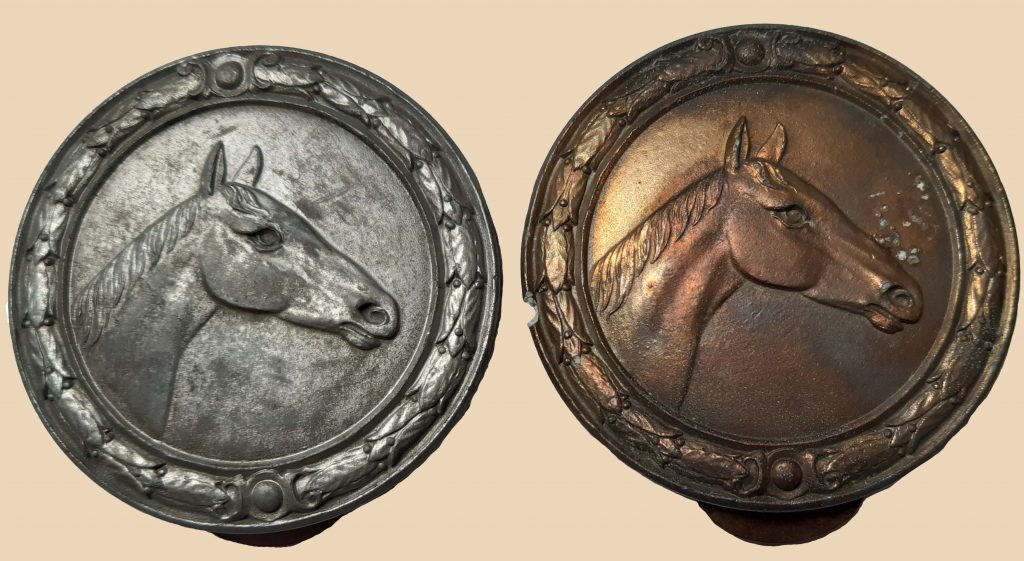 A jelvény 440-450 mm átmérőjű. 110-120 mm-es peremén kiemelkedő babérkoszorú fut körbe, melyet 12 és 6 óra magasságában egy-egy kerek csat fog össze. A középrészen, művészi kivitelű jobbra néző, domború lófej látható. Hátoldalán függőlegesen forrasztott, lapított Ω betűre hajazó rögzítőfül található. Viselése a zubbony jobb zsebe felett volt előírva.