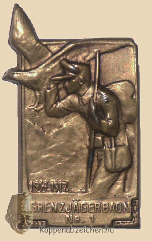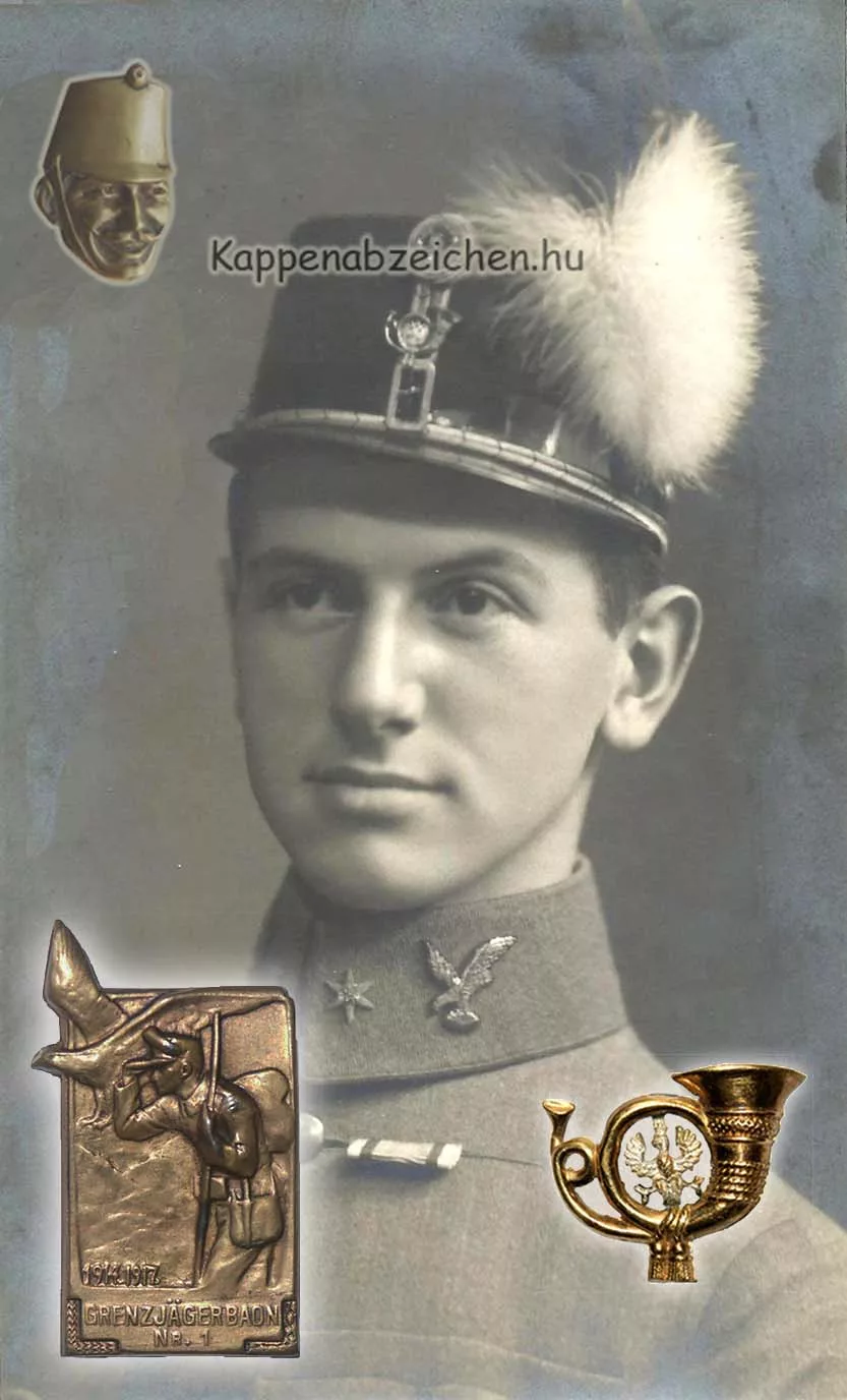 Sajnos, a ritka gallérjelvényről nem tudok fotót adni, mert nekem nincs ilyen jelvényem. A fegyvernemi jelvény ugyanakkor megjelenik az 1. határvadász zászlóalj jelvényén. Ennek ugyanaz az érdekessége, mint a fotónak is: a rajta ábrázolt katona a tiroli lövészek fajdtollas díszítésű tábori sapkáját viseli. Kezében pedig a szintén csak a tiroli egységekre jellemző hosszú botot tartja. Ezek szerint bár a források nem említik, voltak Tirolba átvezényelt határvadászok, az 1. zászlóalj mindenképpen.